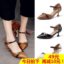 春季单鞋女韩版皮带扣细跟尖头鞋拼色侧空高跟鞋百搭浅口小皮鞋潮