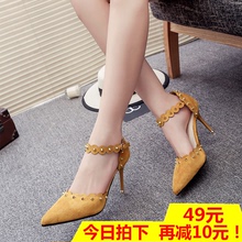2017春季新款尖头浅口绒面波浪花边一字扣中空细跟高跟单鞋女鞋
