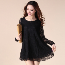 2017春装新款大码胖MM女蕾丝雪纺中长款宽松显瘦长袖打底衫连衣裙