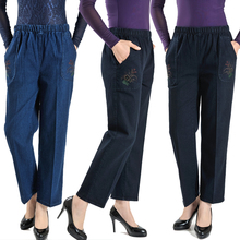 中老年女裤薄款牛仔裤女高腰弹力大码直筒妈妈装松紧腰绣花长裤子