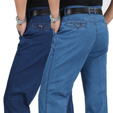 夏季薄款中老年男士牛仔裤高腰大码直筒弹力牛仔长裤爸爸宽松男裤