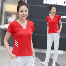 运动套装女夏纯棉V领短袖白色长裤广场舞服装妈妈运动服园服团购