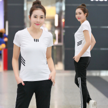 夏季运动服女套装修身显瘦短袖长裤V领运动健身女跑步休闲服装