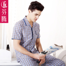 芬腾睡衣2014夏季新款男士简约休闲绅士格子梭织纯棉家居服套装