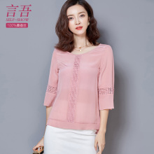 言吾2017夏装新款桑蚕丝雪纺衫女 七分袖宽松纯色气质真丝上衣