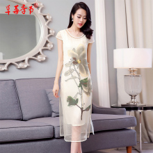 真丝连衣裙2017夏装新款印花改良旗袍中裙修身显瘦大码妈妈桑蚕丝