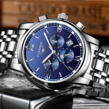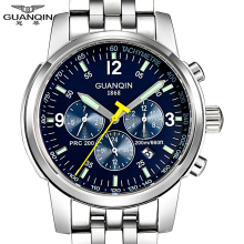 冠琴GUANQIN防水三眼运动石英表精钢带手表户外休闲男士腕表男表