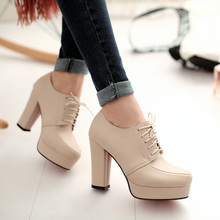 2017春季新款欧美女士系带深口高跟女单鞋圆头粗跟女鞋防水台秋鞋