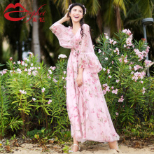 美妃2017春夏新款V领印花雪纺九分袖长裙大摆连衣裙女LQ9039-1