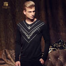 凡转男士2015秋季新款V领烫金T恤衫黑色修身青年打底衫5017
