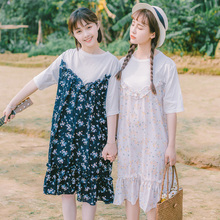 2017夏季新款日系复古田园碎花假两件拼接吊带裙连衣裙百搭简约女