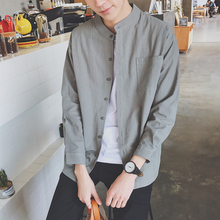 2017春夏韩版亚麻白衬衫男长袖立领修身日系复古棉麻休闲打底衬衣