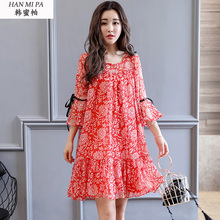 2017夏季新款韩版时尚宽松大码裙子不规则夏天大红色雪纺连衣裙女