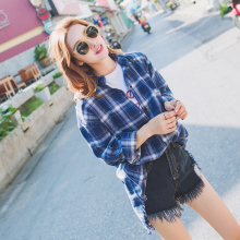 艾加2017春装红黑格子女衬衫韩版宽松百搭显瘦长袖流苏花衬衣上衣
