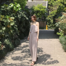 艾加春夏新韩版两穿奶茶色系小格子连体九分裤度假休闲旅游百搭潮