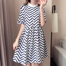 2017新款裙子女夏季韩版雪纺连衣裙条纹收腰显瘦夏装短袖V领a字裙