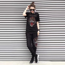 gr欧洲站女装2017年春季新款高温烫钻老虎头短袖休闲裤套装情侣