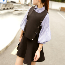 2017春装新款女装韩版条纹衬衣马甲两件套范泡泡灯笼袖衬衫女上衣