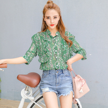 2017夏季新款韩版潮学生立领荷叶边拼接五分袖雪纺衫女装碎花上衣