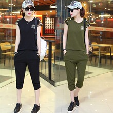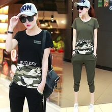 2017新款休闲运动套装女夏短款迷彩户外跑步服宽松大码纯棉两件套