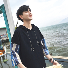 港风春夏林弯弯韩版拼接时尚连帽七分袖T恤潮男青年插肩袖BF风男T