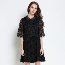 胖妹妹2017新款大码蕾丝连衣裙女胖mm中长款蝴蝶结钉珠胸花打底衫