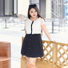 辣妈起义2017夏装加大码女装韩版修身蛋糕裙荷叶边拼接雪纺连衣裙