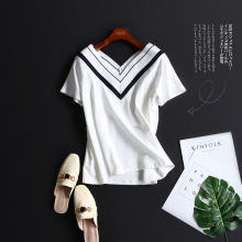 DMT705134出口日韩 CHAO经典~夏季新品薄款v领短袖条纹棉T恤女