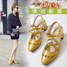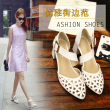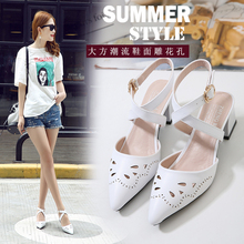 2017新款夏季镂空透气女鞋尖头粗跟包头中跟一字搭扣中空女士凉鞋