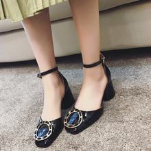 2017春季浅口中跟漆皮一字式扣带女鞋韩版百搭圆扣粗跟方头单鞋女