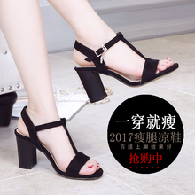 夏季韩版中跟凉鞋高跟鞋罗马t字带一字扣显瘦学生女鞋粗跟凉鞋女