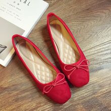 甜美细带蝴蝶结秋款女生平跟鞋气质浅口方头绒面舒适大码平底单鞋