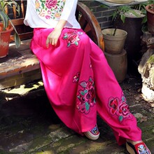 2017春装新款民族风亚麻绣花女裤休闲裤灯笼裤垮裆夸张裤春秋长裤