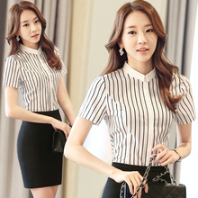 职业装条纹衬衫短袖女修身正装工作服衬衣女韩版百搭清新套裙夏装