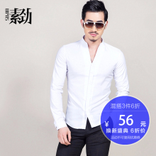 素劲中国风男衬衣 修身纯色长袖男装上衣潮男立领白色衬衫9829