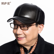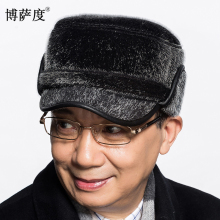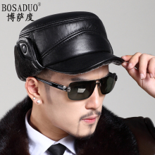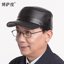 博萨度平顶军帽真皮帽子男士户外休闲中老年人爸爸牛皮护耳帽冬天
