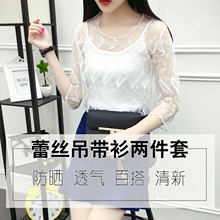 清新羽毛蕾丝吊带衫短款七分袖上衣T恤女 夏透视防晒衣两件套薄款