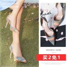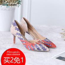 老鼠诚2017夏季新款高跟鞋细跟单鞋浅口尖头拼色气质性感女鞋编织