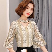2017夏装新款女装韩版修身显瘦女士蕾丝打底衫喇叭袖镂空花朵上衣