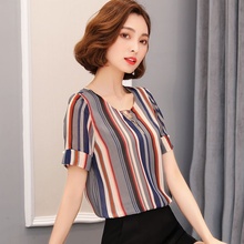 条纹衬衫女2017夏装新款韩版V领雪纺衫上衣T恤夏季韩范短袖衬衣潮