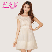 2016夏季新款女装韩版修身短袖网纱蕾丝裙子欧根纱刺绣裸色连衣裙