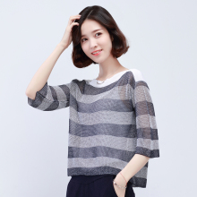 t恤女短款春夏装针织大码宽松镂空一字领七分袖条纹上衣薄款