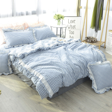 韩式全棉水洗棉四件套 荷叶边蓝色格子日式被套床单床上用品