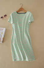 海锚家外贸大码女装针织纯棉修身显瘦中长款条纹短袖连衣裙2017夏