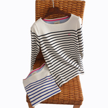 2017春秋新款女英国原单剪标尾货纯棉圆领长袖条纹简约英伦风T恤