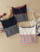 青春清新文艺范闺蜜装一字船领简约纯棉横条纹长袖宽松T恤 女春秋