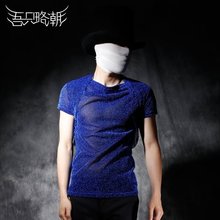 2017夏天t恤男蓝色透明打底衫个性纱质包肩设计休闲短袖T恤夏潮流