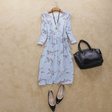 2017新品女装桑蚕丝双绉连衣裙小清新V领短袖长裙纯真丝长裙