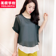 2017夏装韩版新款宽松大码雪纺衫女装夏短袖圆领显瘦T恤上衣胖mm