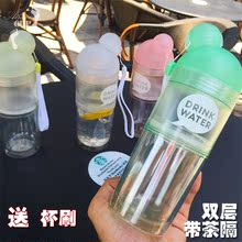 创意双层塑料随手杯柠檬花茶便携带盖提绳茶隔饮料韩国学生水瓶子